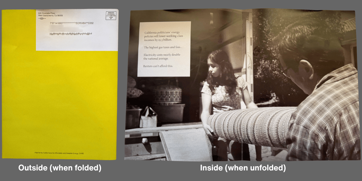 No teaser. No headline. Just an address area and a microscopic “Paid for by Californians for Affordable and Reliable Energy” line that answers exactly zero questions.